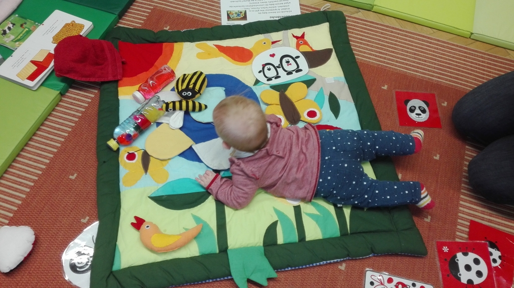 Eine die Sinne ansprechende Raumgestaltung lädt Babys und Eltern dazu ein, gemeinsam zu entdecken, zu spüren, zu spielen und so die Eltern – Kind – Bindung zu stärken. Verschiedene Stationen (Gleichgewicht, Spüren über die Haut, Sehen, Hören und Tiefenwahrnehmung) regen die Entwicklung und Wahrnehmung der Kinder an. Interaktionsfähigkeiten nach dem Konzept Marte Meo werden erklärt. Fragen zu Entwicklungs– u. Regulationsthemen (z.B.: Schlafen, Füttern, Weinen) werden besprochen.